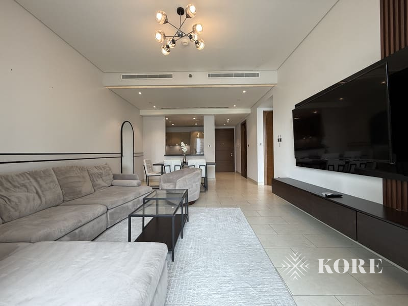 Designed with elegance and functionality in mind, the apartment features a spacious open-plan layout complemented by high-quality furnishings and contemporary finishes. The living and dining area flows seamlessly, creating a bright and welcoming atmosphere, while large windows invite natural light and offer calming views of the surrounding greenery. The fully equipped kitchen is fitted with modern cabinetry and appliances, making it perfect for both everyday living and entertaining.